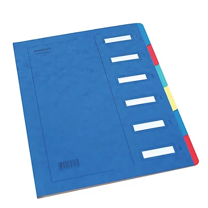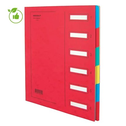 Intérieur carte forte de couleurs vives. Couverture carte lustrée 5/10e avec fenêtres découpées pour un indexage pratique. Dim. : 24 x 32 cm. Lot de 3 trieurs assortis (bleu, havane et rouge). Trieurs 6 touches.