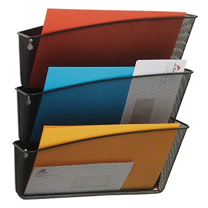 - Le set de corbeilles se compose de 3 compartiments en métal ajouré mesh. Les corbeilles peuvent accueillir tous les documents A4 de dimension 24 x 32 cm. Elles se fixent au mur avec 2 vis fournies et sont superposables.