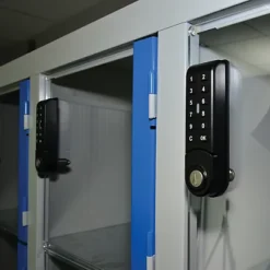 Vestiaire 3 X 5 Cases Gris/ Bleu Portes Plexi à Serrure E10 à Code électronique