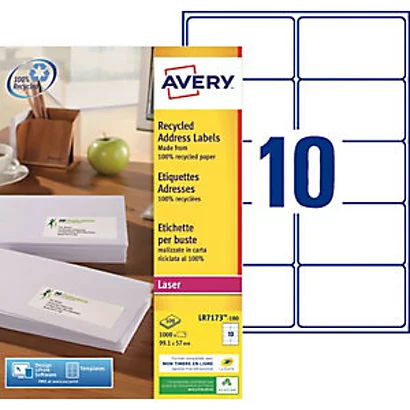 - Choisir ces étiquettes adresses laser en papier 100% recyclé Avery c’est faire un geste pour l’environnement. L’emballage est également en carton recyclé et leur production contribue au reboisement des forêts françaises. Ces étiquettes sont faciles à détacher de la planche : vous gagnez du temps lors de vos publipostages et vous pouvez ainsi les appliquer directement sur vos colis après impression. Pratique, leur format est compatible avec le service ‘Mon timbre en ligne’ de La Poste : imprimez ainsi vos timbres directement depuis votre poste de travail. Adaptées à l’impression dans la plupart des imprimantes laser, vous pouvez personnaliser vos étiquettes avec les modèles et le logiciel gratuits Avery Design & Print sur www.avery.fr, faciles à télécharger, faciles à utiliser.