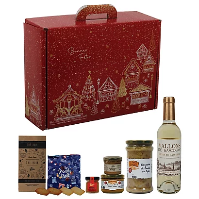 Dans cette élégante valisette rouge portant l’inscription « Bonnes fêtes », vous trouverez :