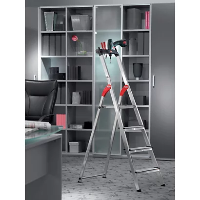 Composé de 4 marches plateforme incluse, d’un bac multifonctions pouvant accueillir pots de peinture et outils (perceuse, tournevis ). Il possède aussi un crochet porte-seau et un serre câble.