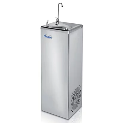 La fontaine sur réseau est un distributeur d’eau qui se branche directement sur une arrivée d’eau potable et sur une prise électrique.