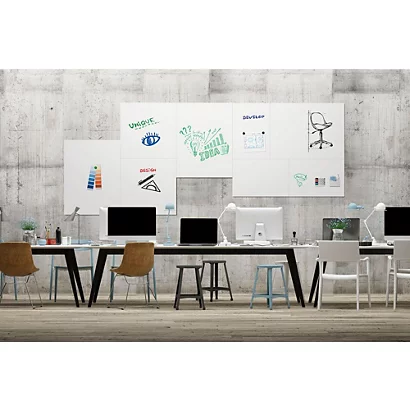 - Associez ces tableaux blancs sans cadres aux formats variés afin d’obtenir de grandes surfaces d’écriture !