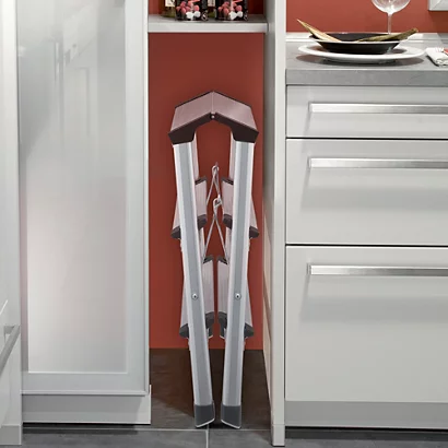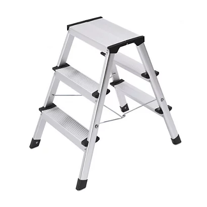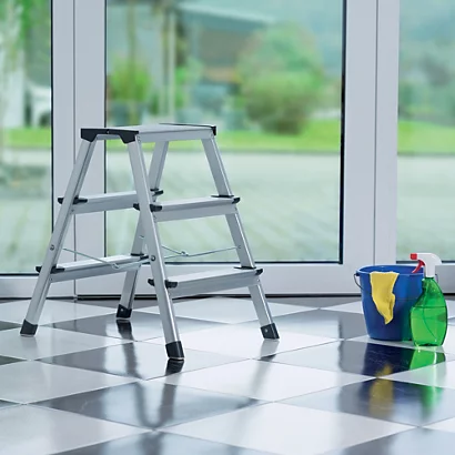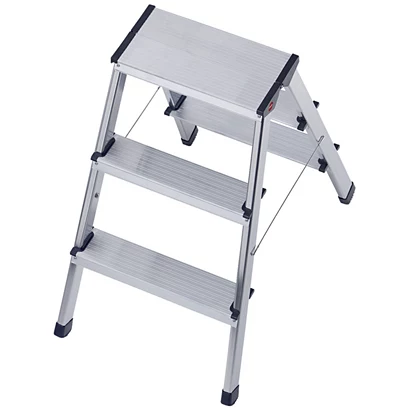 Montants en aluminium anodisé, marches en alu cannelées, larges et tprofondes pour un confort de travail optimal.