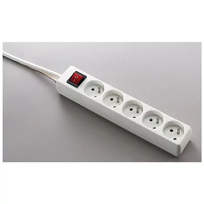 - Bloc en plastique, muni de 5 prises normalisées avec un interrupteur général et une prise de terre sur chacune. Cette multiprise permet la juxtaposition des branchements.