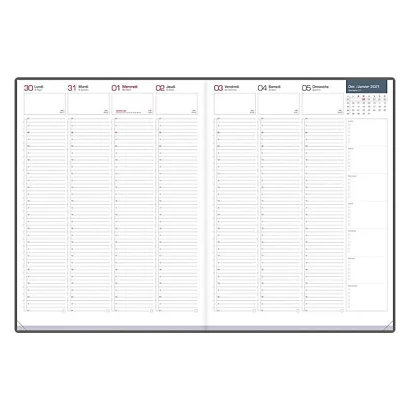 Gérez votre année l’esprit libre avec un agenda professionnel, simple et efficace. Une grille professionnelle à large amplitude horaire et couvrant 7 jours complets.