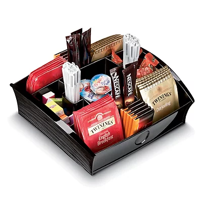 Un plateau distributeur pour mettre à disposition sur la table les assortiments variés de thé, café, chocolat, lait, sucres
