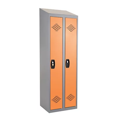Le vestiaire Industrie propre 2 cases, toit incliné, corps gris, portes oranges, livré monté.