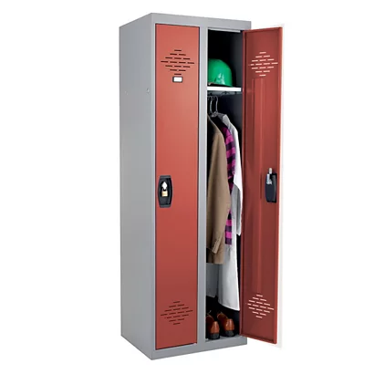 Le vestiaire Industrie propre 2 cases, toit plat, corps gris, portes rouges, livré monté.
