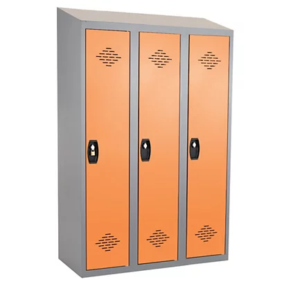 Le vestiaire Industrie salissante 3 cases, toit incliné, corps gris, portes oranges, livré monté.